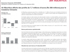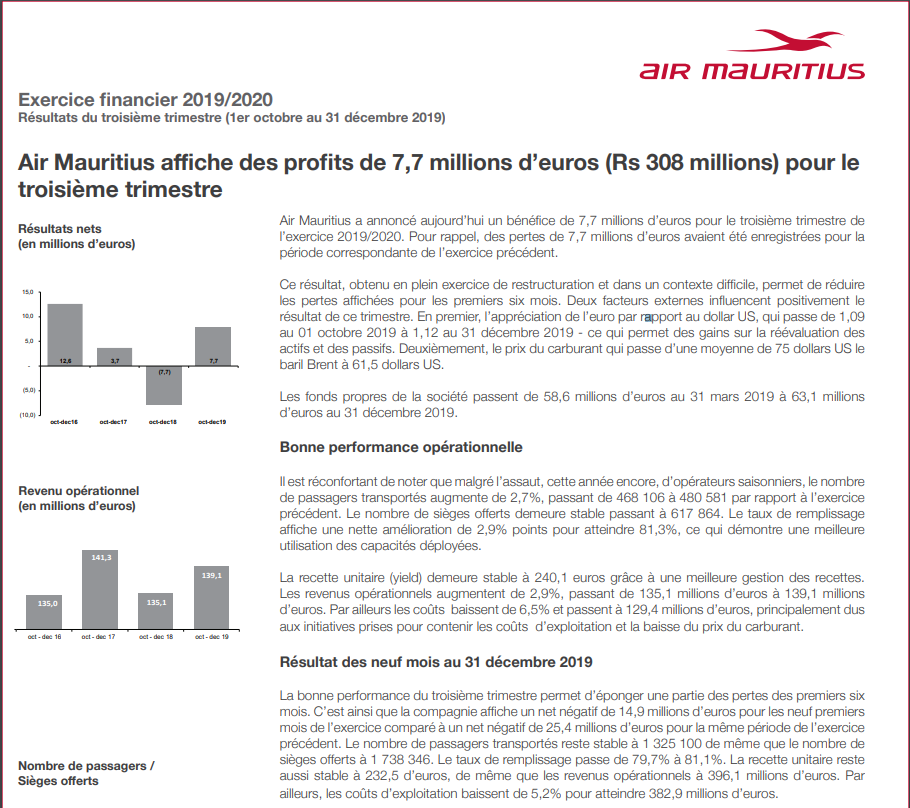 Air Mauritius a annoncé aujourd’hui (jeudi 13 février) un bénéfice de 7,7 millions d’euros (Rs 308 millions) pour le troisième trimestre de l’exercice 2019/2020. Pour rappel, des pertes de 7,7 millions d’euros avaient été enregistrées pour la période correspondante de l’exercice précédent. Ce résultat, obtenu en plein exercice de restructuration et dans un contexte difficile, permet de réduire les pertes affichées pour les premiers six mois.