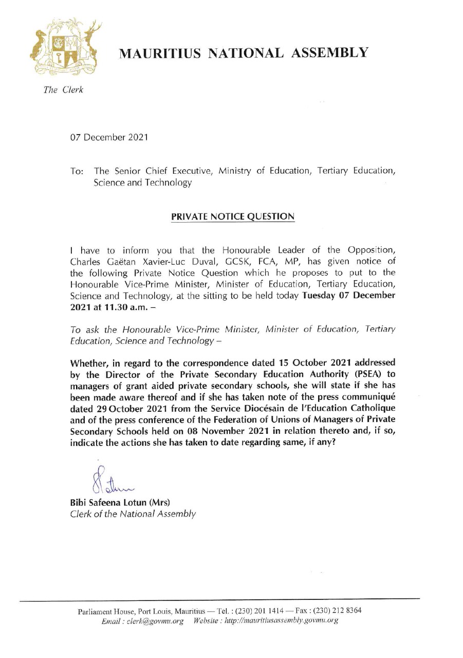 La Private Notice Question (PNQ) du leader de l’opposition adressée à la ministre de l’Éducation ce mardi (7 décembre 2021) à l'Assemblée nationale. La question s’articule autour d’une correspondance de la PSEA, adressée aux collèges privés subventionnés par l’état, datant du 15 octobre 2021, et également un communiqué émis par le SEDEC 2 semaines plus tard, de même qu’une conférence de presse tenue par la Federation of Unions of Managers of Private Secondary Schools, le 8 novembre dernier. S’ensuivront les questions parlementaires. L’ordre du jour fait mention de 76 questions, dont 14 dans le cadre de la Prime Minister’s Question Time, notamment sur la COP 26 et le Reward Money de la police. Les débats sur l’Offshore Petroleum Bill se poursuivront dans l’après-midi. Le Mauritius Recreation Council Bill est également inscrit en deuxième lecture, et en troisième lecture.