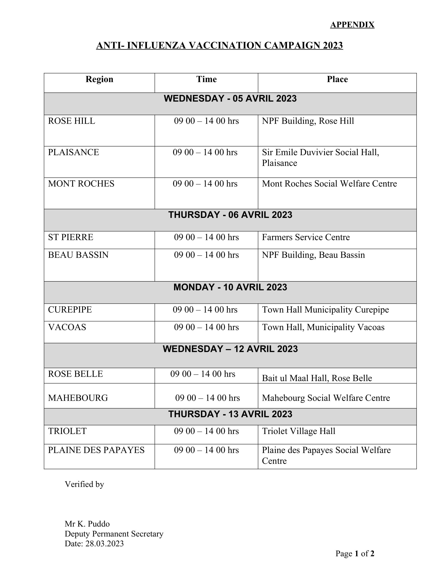 Le Ministère de l'Intégration Sociale, de la Sécurité Sociale et de la Solidarité Nationale organisera une campagne de vaccination anti-grippe pour les personnes âgées de 60 ans et plus, du 05 avril au 03 mai 2023, tous les lundis, mercredis et jeudis dans plusieurs régions de l'île. Pour se faire vacciner, chaque personne devra présenter sa carte d'identité nationale, sa carte de vaccination antigrippe et sa carte de vaccination contre la Covid-19. Pour plus d'informations sur les dates et les lieux de la campagne, veuillez consulter le calendrier de vaccination ci-dessous :