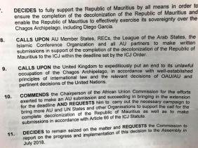 L'Union Africaine (UA) a, ce lundi soir, adopté à l'unanimité à la clôture de son 30ème Sommet des chefs d'état et de guvernement à Addis Abena en Ethiopie, la propoistion faite par le Premier ministre mauricien ce matin pour une résolution concernant le dossier Chagos devant la Cour International de Justice ( CIJ). Ainsi l'UA demande à ses membre de soumettre à la CIJ dans le délai prescrit ,à travers un ordre, des représentations écrites pour soutenir l'achèvement du processus de décolonisation de Maurice. L'Union Africaine appelle, dans cette optique, le Président de la Commission de l'Union Africaine à mener une campagne de lobbying pour encouragre davantage de membres de l'UA et de l'ONU et d'autres organisations à assurer leur soutien à la démarche maurcienne. Elle exhorte une nouvelle fois le Royaume Uni de mettre fin à son occupation illégale de l'Archipel du Chagos conformément aux principes du droit international et des décisions de l'OUA/UA et des Nations Unies. Un rapport sur le progrès accompi et la mise en oeuvre des décisions sera présenté lors de l'Assemblée de la Commission en juillet prochain