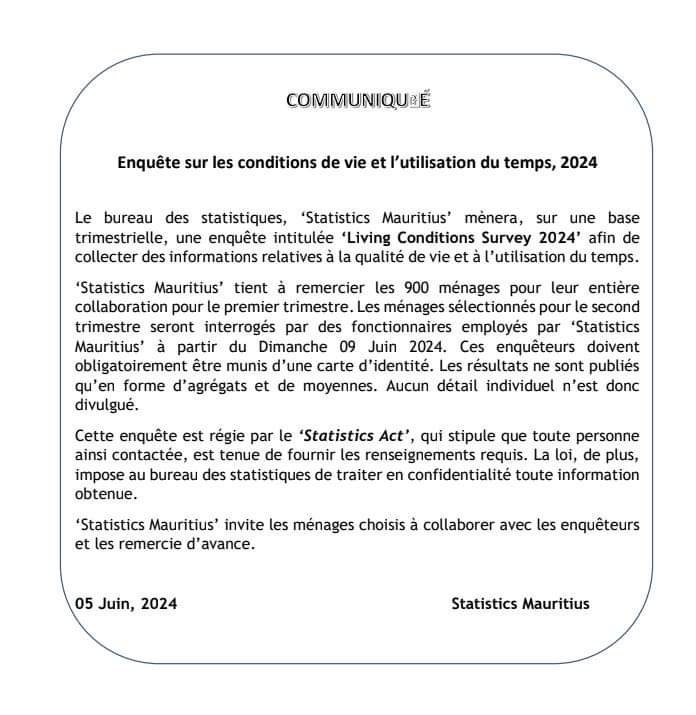 [COMMUNIQUÉ] Statistics Mauritius : Enquête sur les conditions de vie et l’utilisation du temps en 2024