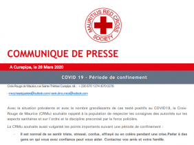 La CroixRouge de Maurice (CRMu) rappelle à la population de respecter les consignes des autorités sur les aspects sanitaires et sur l’ordre et la discipline préconisé par la force policière. Elle a d’ailleurs mis à la disposition du public un numéro de contact (5 797 0095) pour les conseils et info pratiques. La CRMu souhaite aussi vulgariser les points importants suivant une période de confinement :