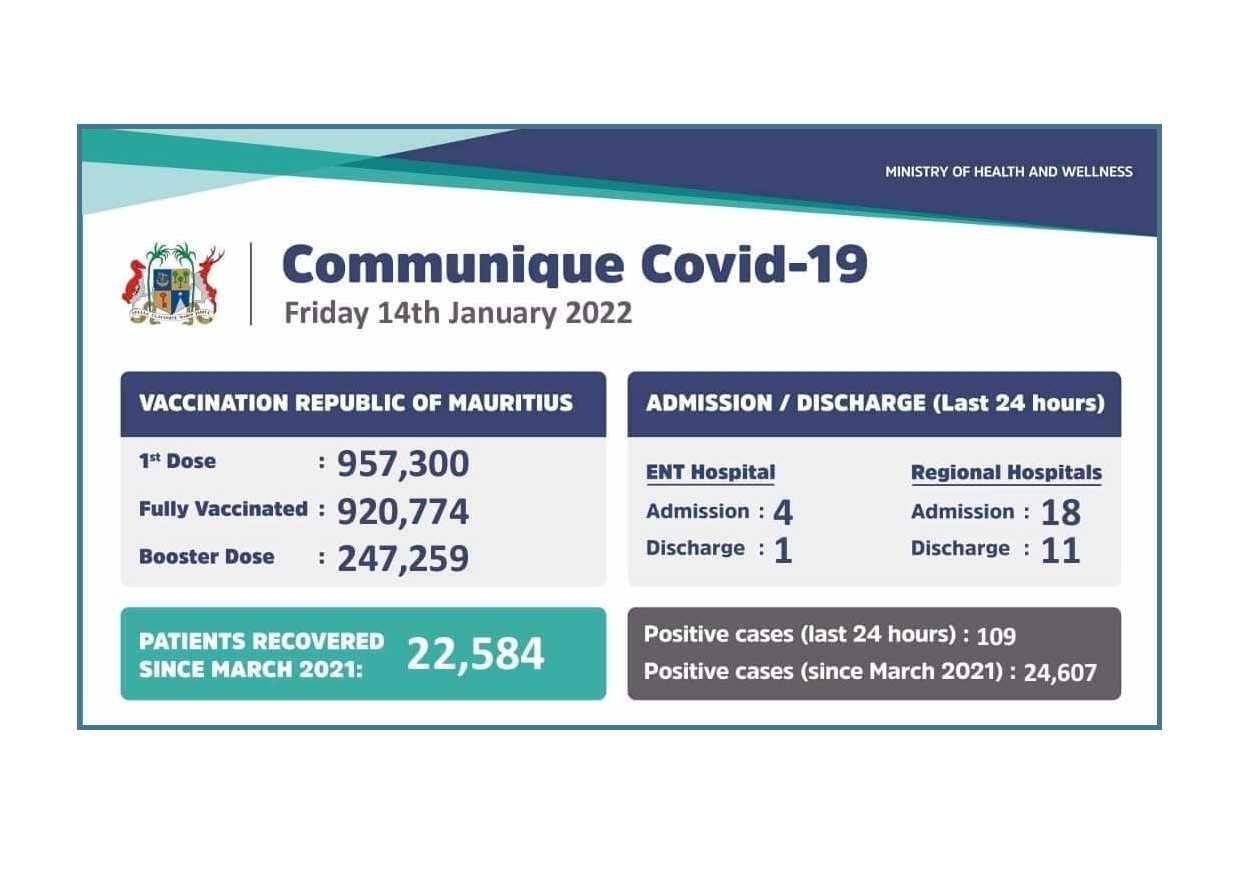 109 nouveaux cas de la Covid-19 ont été détectés ces dernières 24 heures à Maurice. Quatre personnes ont été admises à l’hôpital ENT et 18 ont été admises dans les hôpitaux régionaux. Concernant la vaccination, 247 259 personnes ont effectué la « Booster Dose » à ce jour.