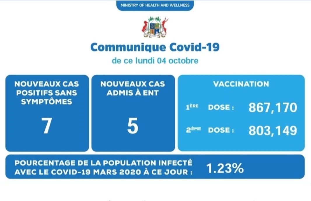 Oct 04, 2021 | Posted by DA | 0 12 nouveaux cas de la Covid-19 ont été détectés ces dernières 24 heures. Parmi, 7 sont des cas sans symptômes et 5 cas ont été admis à l'hôpital ENT. C'est ce qui ressort d'un communiqué du ministère de la Santé ce lundi 4 octobre. View the discussion thread.