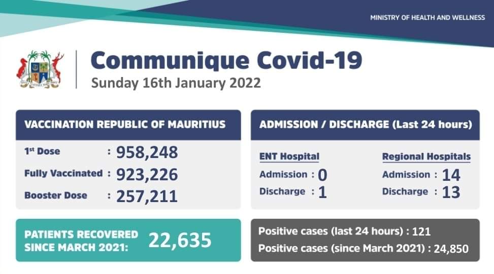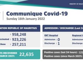 Le nombre des cas positifs enregistrés ce dimanche est de 121. Aucun patient n'a été admis à l’hôpital ENT de Vacoas. 14 patients ont été admis dans les hôpitaux régionaux. Du mars 2021 à ce jour, 24, 850 cas de Covid-19 ont été détectés à Maurice. Le nombre des patients guéris est de 22,635.
