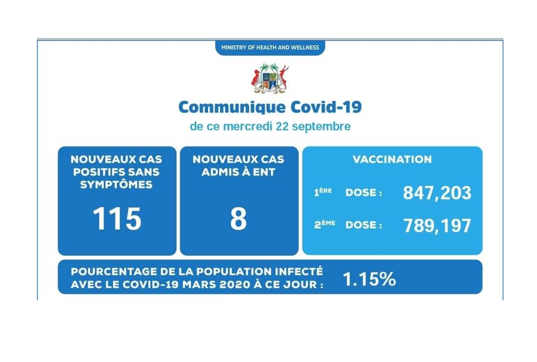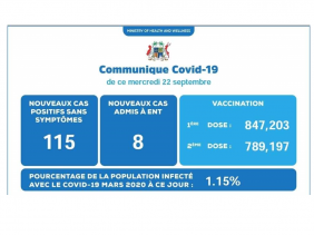 Sep 22, 2021 | Posted by DA | 0 123 nouveaux cas de la Covid-19 ont été détectés ces dernières 24 heures à Maurice. Parmi, 115 sont des cas sans symptômes et 8 cas ont été admis à l'hôpital ENT. View the discussion thread.