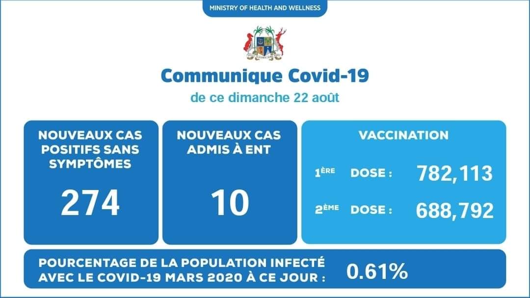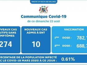 Aug 22, 2021 | Posted by Christelle Lebrasse | 0 Le pays compte 274 nouveaux cas de Covid-19 asymptomatiques. 10 personnes ont été admises à l' hôpital ENT pour recevoir des soins. View the discussion thread.