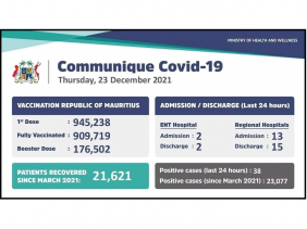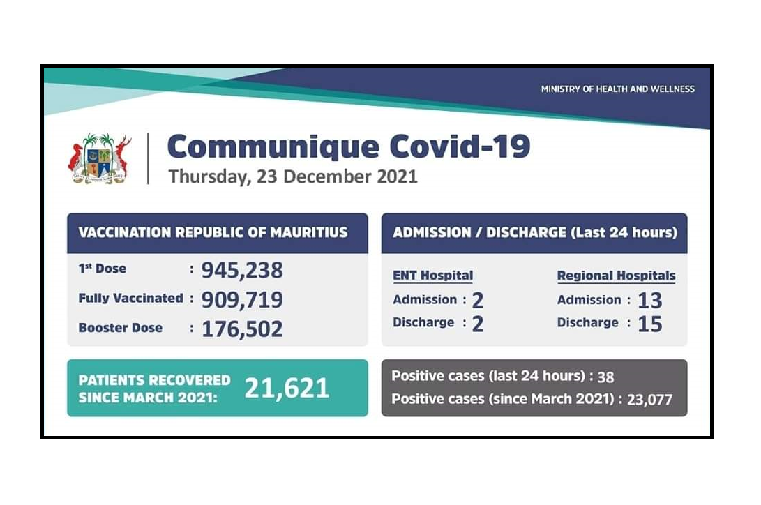 38 nouveaux cas de la Covid-19 ont été détectés ces dernières 24 heures à Maurice. Deux personnes ont été admises à l’hôpital ENT et 13 personnes ont été admises dans les hôpitaux régionaux. Concernant la vaccination, 176 502 personnes ont reçu la « Booster Dose » à ce jour.