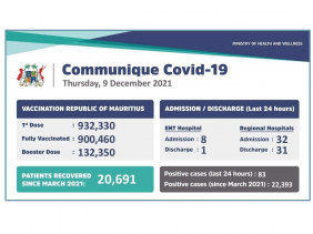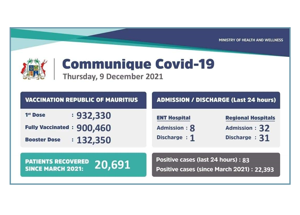 83 nouveaux cas positifs de la Covid-19 ont été détectés ces dernières 24 heures à Maurice. 8 patients ont été admis à l’hôpital ENT alors que 32 personnes ont été admises dans les hôpitaux régionaux. Concernant la vaccination, 132, 350 personnes ont reçu une dose de rappel à ce jour.