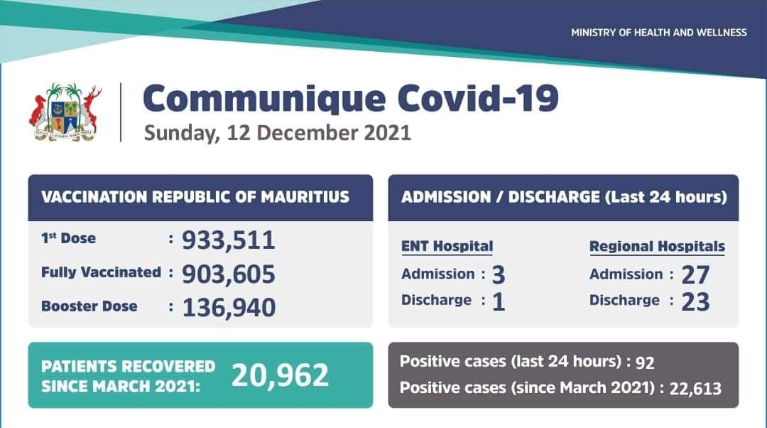 Le nombre des cas positifs enregistrés ce dimanche est de 92. Trois patients ont été admis à l’hôpital ENT de Vacoas, et 27 autres dans les hôpitaux régionaux. Du mars 2021 à ce jour, 22, 613 cas de Covid-19 ont été détectés à Maurice. Le nombre des patients guéris est de 20,962.