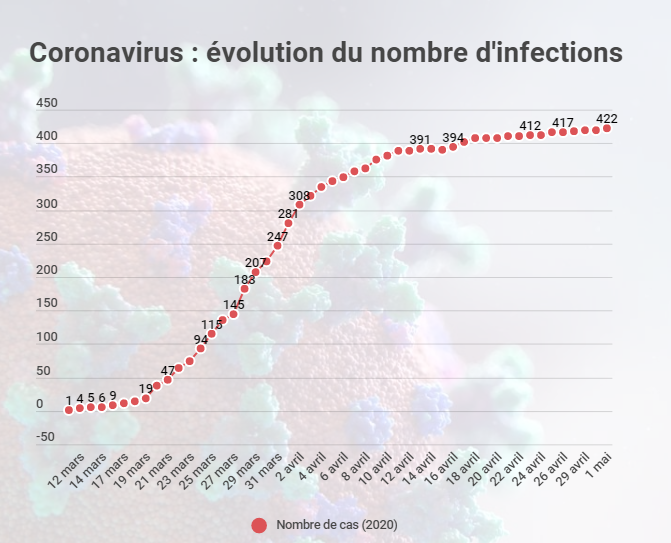 La préfecture et l’ARS (Agence Régionale de Santé) ont annoncé deux nouveaux cas confirmés (hier ; vendredi 1er mai 2020) à La Réunion. Le bilan est donc à 422 cas de coronavirus dans l'île. Les cas importés représentent 70% des cas.