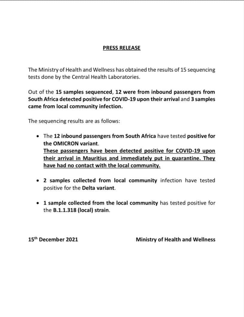 Par ailleurs, le ministère de la Santé a obtenu les résultats de 15 tests de séquençage effectués par le laboratoire central de la Santé. De 15 échantillons, 12 proviennent de passagers de l’Afrique du Sud, testés positifs, à leur arrivée ; 3 sont de la communauté locale. Les tests ont révélé que les 12 cas de l’Afrique du Sud sont positifs au variant omicron ; ils ont été immédiatement placés en quarantaine, et n’ont pas eu de contact avec la communauté locale. D’autre part, 2 cas locaux d’infection sont positifs au variant delta, et un cas positif à la COVID B.1.1.318. C'est ce qui ressort d'un communiqué du ministère de la Santé, émis hier (mercredi 15 décembre 2021) toujours.