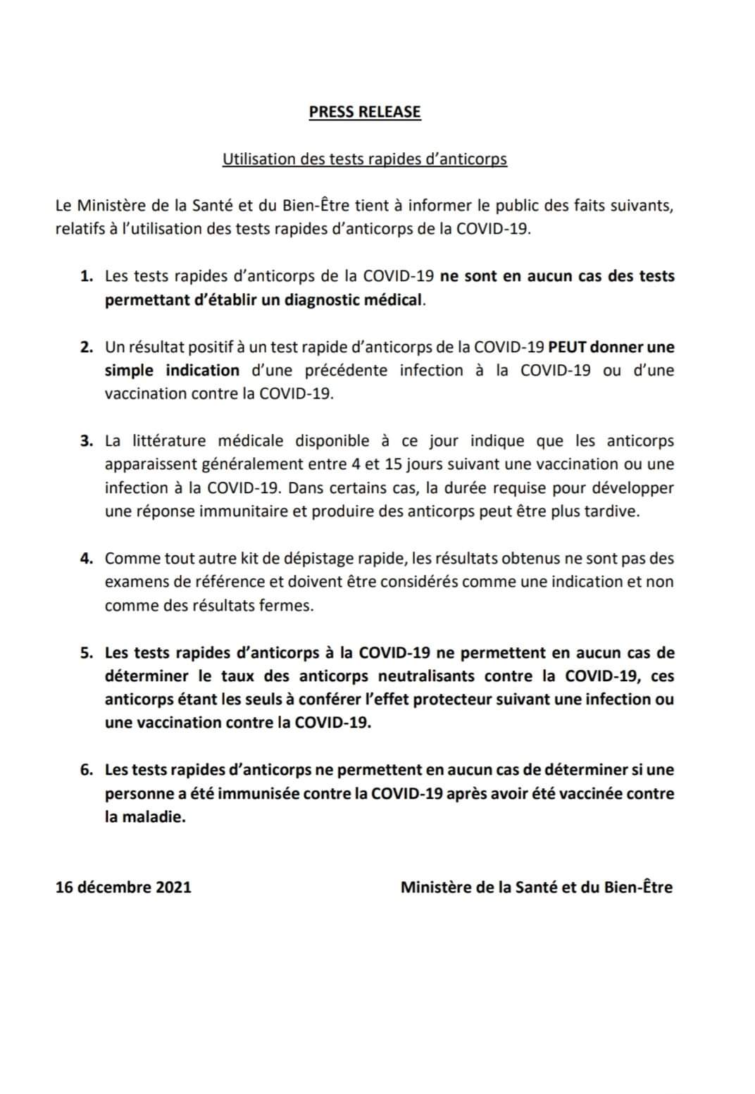 Les tests rapides d'anticorps de la COVID-19 ne sont, en aucun cas, des tests permettant d'établir un diagnostic médical. C'est ce qui ressort d'un communiqué du ministère de la Santé, émis ce jeudi (16 décembre 2021).
