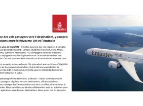 Emirates assurera des vols réguliers à compter du 21 mai 2020 vers neuf destinations dont : Londres, Heathrow Francfort, Paris, Milan, Madrid, Chicago, Toronto, Sydney et Melbourne.