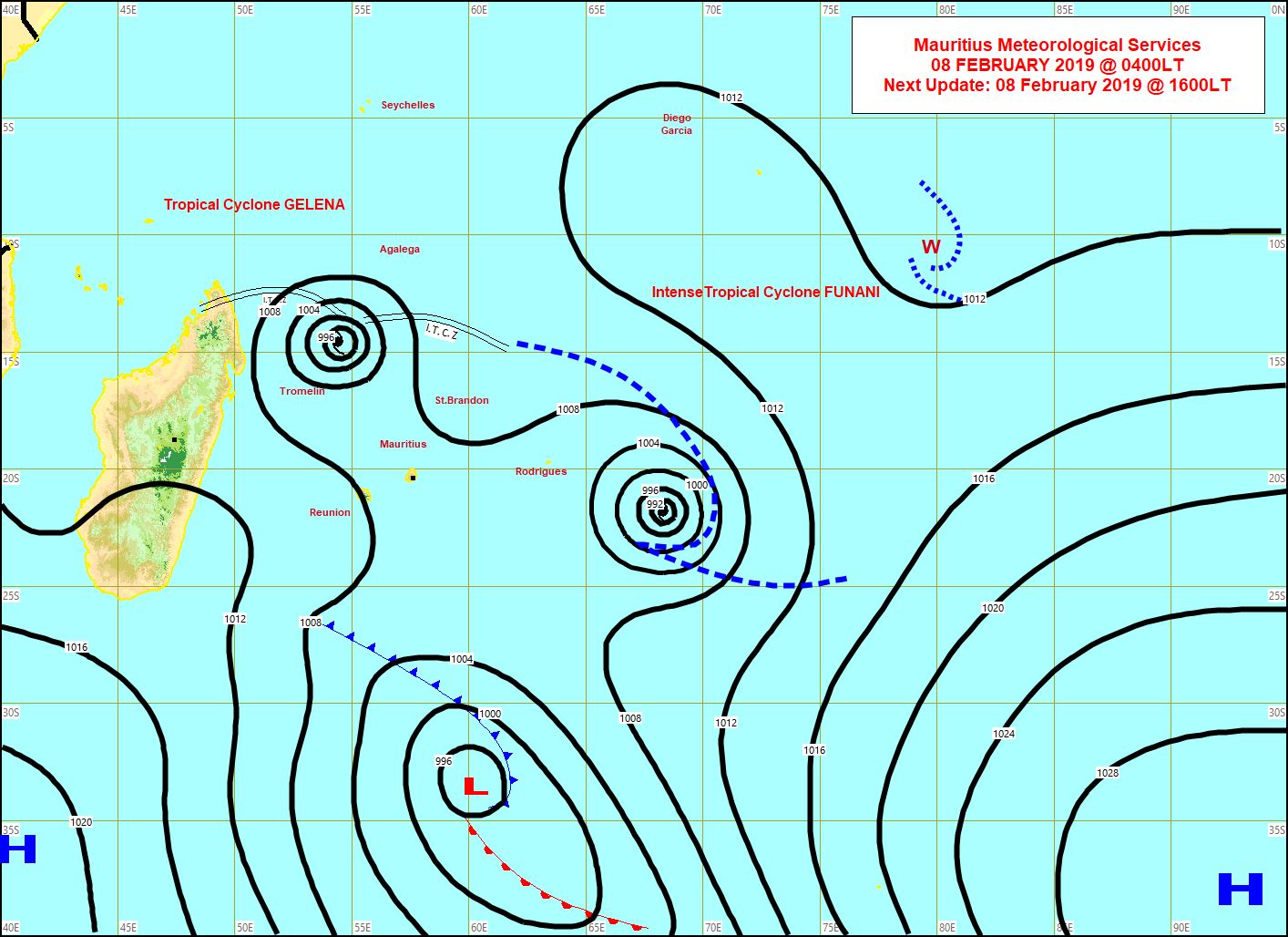 Un avertissement de cyclone de classe I est en vigueur à Maurice. Au cours des dernières heures, le cyclone tropical GELENA s’est intensifié en un cyclone tropical intense.Deuxième bulletin de cyclone pour Maurice émis à 10 h 10 ce vendredi 08 février 2019. À 1000 heures ce matin, l'intense cyclone tropical GELENA se trouvait à environ 660 km au nord-nord-ouest de Maurice soit en latitude 15.0 degrés Sud et longitude 54.4 degrés Est. Il se déplace dans une direction générale du sud-sud-est à environ 12 km/h. Sur cette trajectoire, GELENA représente une menace potentielle pour Maurice.Il y a des indications que GELENA va se déplacer vers le sud-est au cours de la journée et s'approchera de Maurice. D'autre part, le cyclone évoluera dans un environnement plus favorable et devrait s'intensifier davantage à l'approche de notre région, entraînant une détérioration du temps à Maurice à partir de demain matin. Le public à Maurice est conseillé de prendre les précautions préliminaires. Le prochain bulletin sera émis vers 16 h 10.