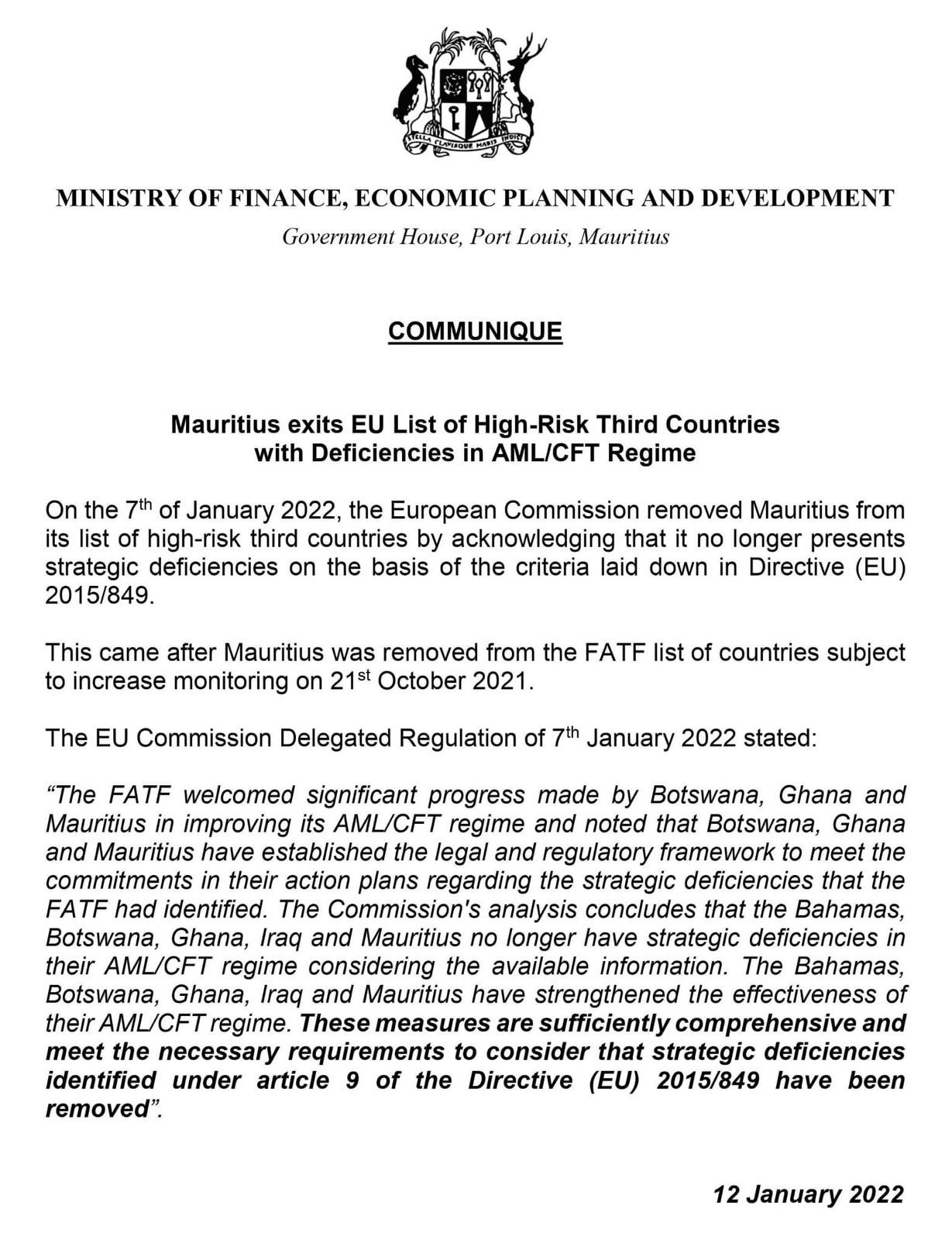Cette bonne nouvelle pour le secteur financier mauricien : la Commission européenne active officiellement le processus d’enlever Maurice de sa liste des pays à haut risque. Bruxelles vient d’émettre le Delegated Regulation à cet effet, et on attend maintenant l’ultime étape de sa publication, bientôt, dans le Journal de l’Union européenne. Dans le camp mauricien, c’est le grand soulagement pour propulser notre secteur des Services financiers à de nouveaux sommets après ce dénouement tant attendu.