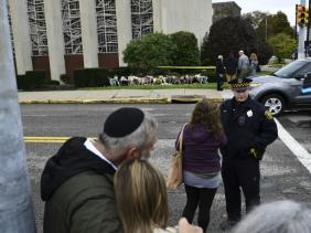 "Les mots de haine ne sont pas les bienvenus à Pittsburgh", a dit le rabbin Myers, ovationné par le public, avant d'adresser un messages aux leaders politiques. "Mesdames et messieurs, cela doit commencer avec vous, nos dirigeants," a-t-il déclaré sous des applaudissements prolongés. "Arrêtez les messages de haine." Le rabbin, qui a aidé des personnes à sortir de la synagogue après les coups de feu, a récité une prière du souvenir en hébreu, essuyant ses larmes avec un mouchoir.