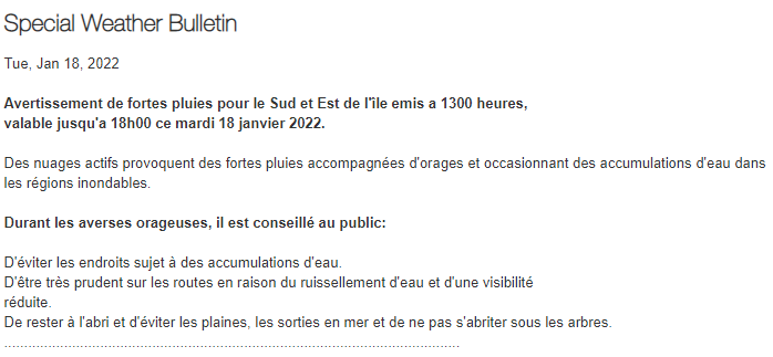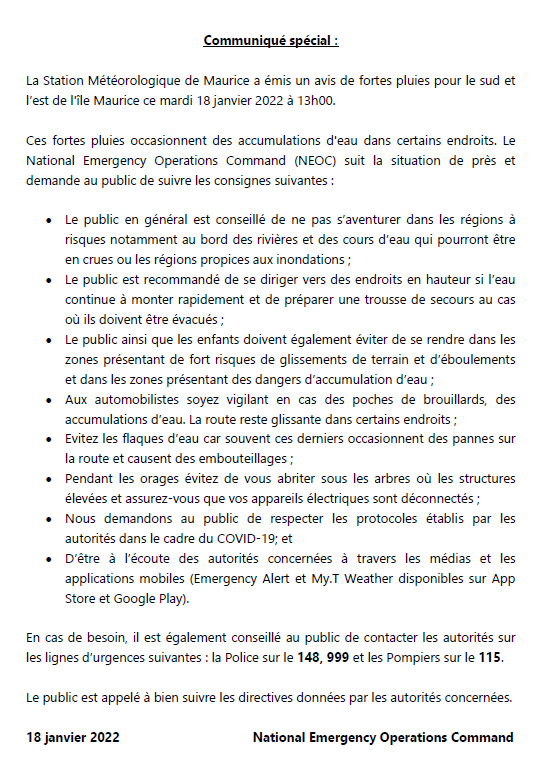 Des nuages actifs provoquent de fortes pluies, accompagnées d'orages et occasionnant des accumulations d'eau dans les régions inondables. Durant les averses orageuses, il est conseillé : D'éviter les endroits sujets à des accumulations d'eau, d'être très prudent sur les routes, de rester à l'abri et d'éviter les plaines, les sorties en mer et de ne pas s'abriter sous les arbres. Par ailleurs, le National Emergency Operations Command (NEOC) suit la situation de près.