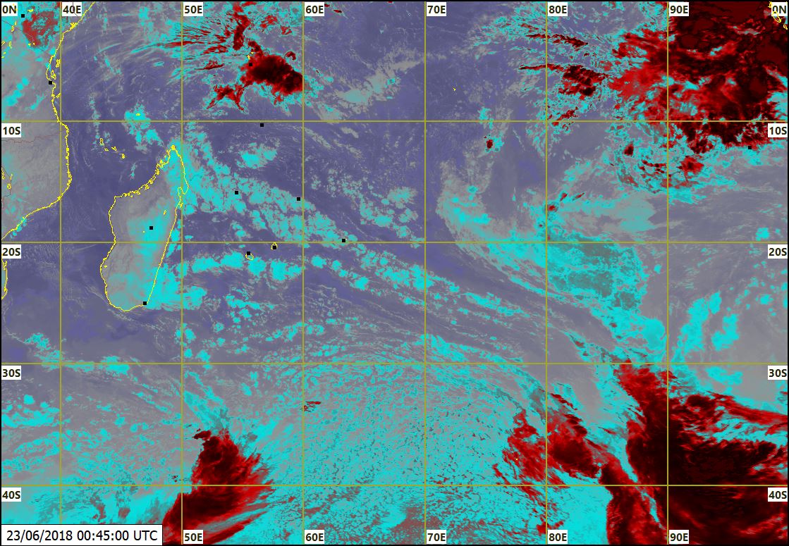 Une faible cellule anticyclonique loin au Sud-Ouest des Mascareignes fait circuler des alizés léger à modéré sur notre région. Beau temps ce matin et en début de la journée. Périodes nuageuses par la suite avec des ondées sur les versants Sud, Est et le Plateau Central. La température maximale variera entre 21 et 24 degrés Celsius sur le Plateau Central et variera entre 26 et 29 degrés Celsius sur les régions côtières. Après quelques ondées dans la soirée sur le Plateau Central, il fera essentiellement beau durant la nuit. Le vent soufflera du Sud-Est entre 15 et 25 km/h avec des rafales de 50 km/h dans certains endroits.