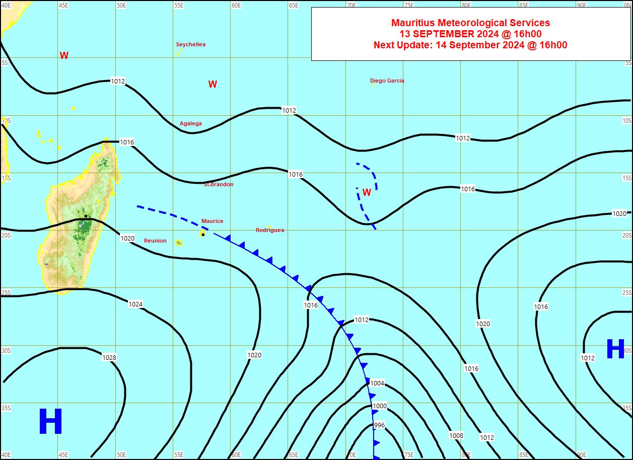Des nuages associés au système frontal influencent le temps local. L'anticyclone presqu'au sud des Mascareignes occasionne un temps venteux et froid sur notre région. C'est ce qui ressort d'un communiqué de la Station météo de Vacoas émis à 4 h 30, ce samedi 14 septembre 2024. Il y aura des périodes nuageuses ce matin et cet après-midi, avec des pluies intermittentes ; principalement à l'est, au sud et sur le plateau central. La température maximale sera inférieure à la moyenne par environ 2 degrés et variera entre 19 et 22 degrés sur le plateau central et entre 24 et 26 degrés sur le littoral.