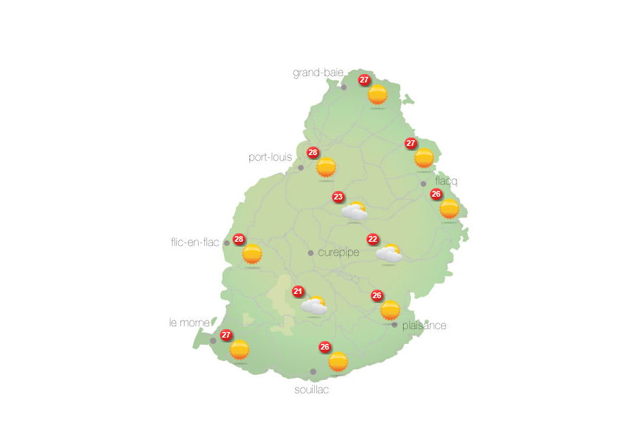 La température maximale variera entre 21 et 23 degrés Celsius sur le Plateau Central et variera entre 25 et 28 degrés Celsius sur les régions côtières. La température minimale sera inférieure à la moyenne par environ 3 degrés Celsius avec 14 à 17 degrés Celsius sur les terrains élevés et 18 à 21 degrés Celsius sur le littoral. Des périodes nuageuses sont prévues durant la nuit sur la partie Sud de l'île et sur le Plateau Central avec quelques ondées. Le temps sera mi-couvert ailleurs.