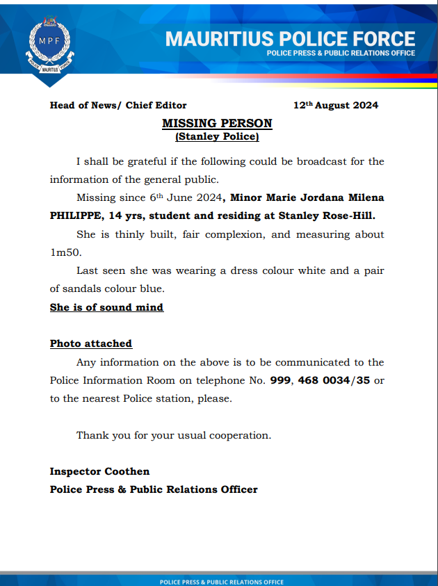 Marie Jordana Milena Philippe âgée de 14 ans et résidant à Stanley Rose-Hill, est portée disparue depuis le 6 juin 2024. Lors de sa disparition, elle portait une robe blanche et des sandales bleues. Toute personne ayant des informations est priée de contacter la police aux numéros indiqués dans ce communique de presse ou de se rendre au poste de police le plus proche.