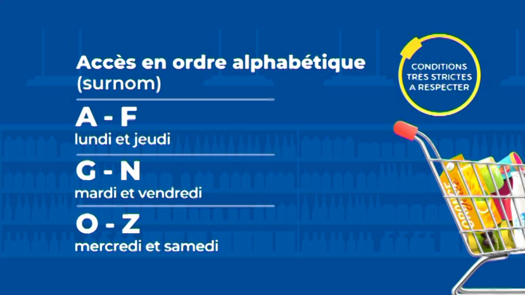 Les personnes dont les noms commencent par les O à Z peuvent se rendre aux supermarchés. Pour rappel, il faut apporter sa carte d’identité, mettre un masque et maintenir la distance de sécurité. Suivez les consignes des autorités afin d’éviter la propagation du Covid-19.