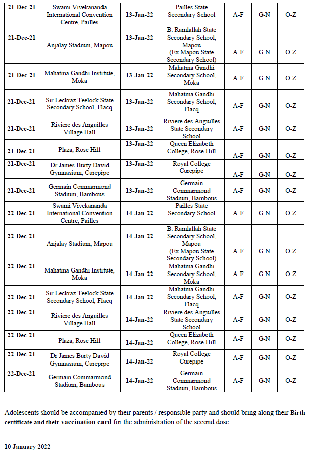 Jan 10, 2022 | Posted by JH | 0 La campagne de vaccination contre le coronavirus se poursuit à Maurice. Voir communiqué du ministère de la Santé (2e dose au Pfizer) : View the discussion thread.