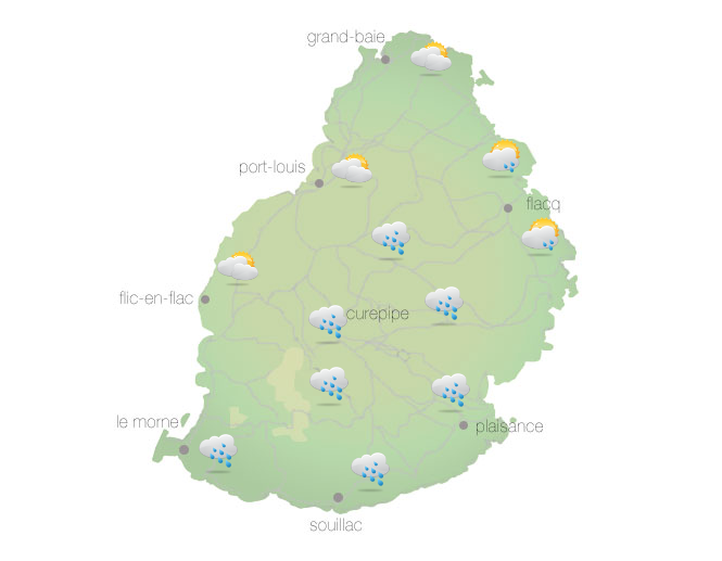 Un courant d'air humide et plutôt instable circule sur notre région. Le ciel sera nuageux sur l'ensemble de l'île, avec des pluies. À partir de la mi-journée, ces pluies seront parfois modérées, surtout à l'est, au nord et sur le plateau central, avec des risques d'orages isolés. Des poches de brouillard seront présentes sur les hauteurs. La température maximale variera entre 22 et 25 degrés Celsius sur le plateau central et entre 27 et 29 degrés Celsius sur le littoral. La température minimale variera entre 18 et 20 degrés Celsius sur le plateau central et entre 22 et 24 degrés Celsius dans les régions côtières. Le vent soufflera de l'est à environ 20 km/h, avec des pointes atteignant 50 km/h dans certaines régions.La mer sera forte au-delà des récifs, avec des vagues de l'ordre de 3 mètres. Les sorties en haute mer, ainsi que dans les lagons de l'est et du sud, sont déconseillées. Toutefois, l'état des lagons s'améliorera graduellement durant la nuit.