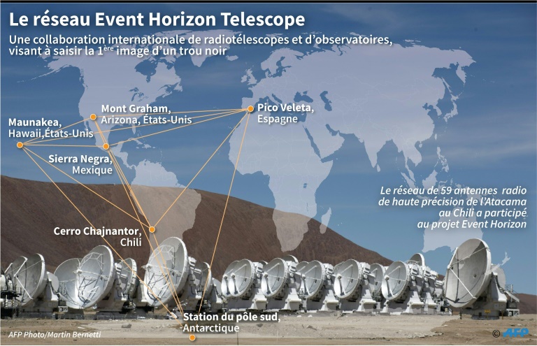 "Une photo, c'est la preuve définitive de l'existence des trous noirs", s'enthousiasme Jean-Pierre Luminet, astrophysicien au CNRS français, auteur de la première simulation numérique d'un trou noir en 1979. "Même dans la communauté scientifique, il y a encore pas mal de résistance", ajoute le scientifique qui voulait déjà à l'époque "donner à voir le trou noir". Les résultats des observations du Event Horizon Telescope seront présentés à 13H00 GMT lors de six grandes conférences de presse organisées simultanément dans plusieurs villes du monde : Bruxelles, Santiago, Shanghai, Tokyo, Taïwan et Washington.