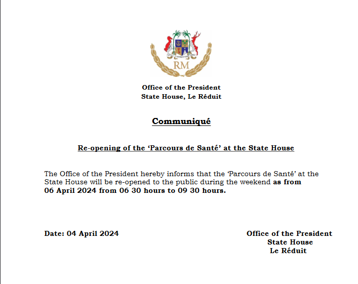 Apr 04, 2024 | Posted by NDD | 0 Le Cabinet du Président informe par la présente que le Parcours de Santé à la State House sera réouvert au public pendant le week-end à partir du 6 avril 2024 de 6 h 30 à 9 h 30. View the discussion thread.