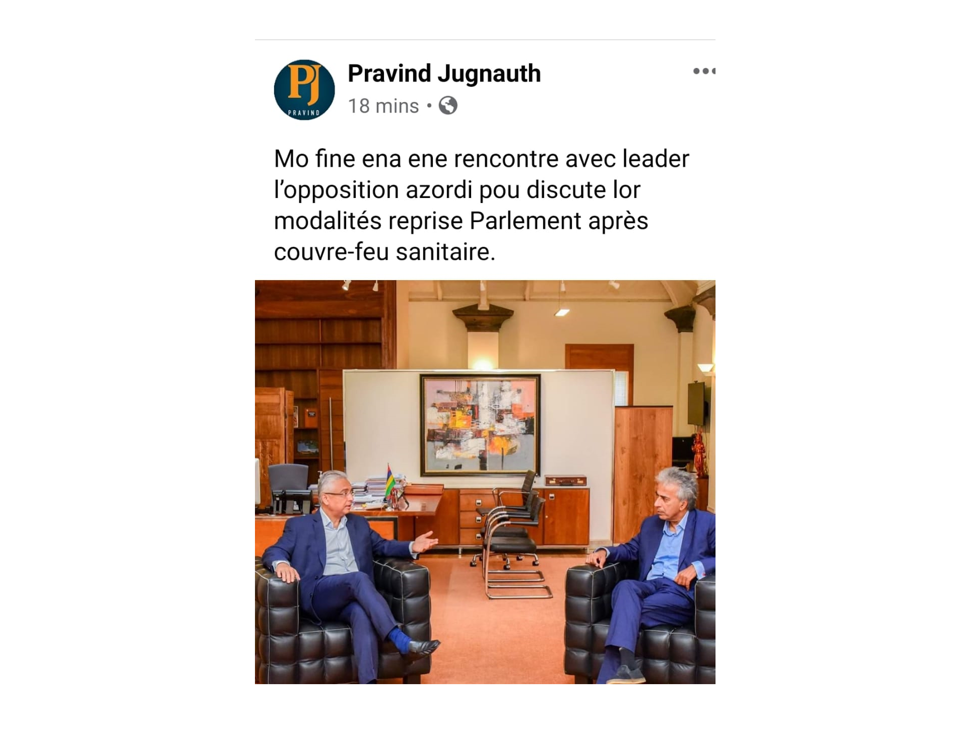 Le Premier ministre, Pravind Kumar Jugnauth a rencontré le leader de l’opposition, le Dr Arvin Boolell ce samedi 18 avril à son bureau à Port-Louis. Il a entre autres, été question des modalités pour la reprise de l’Assemblée nationale à la levée du couvre-feu sanitaire. Le Chef du gouvernement a aussi abordé la suite des débats sur le discours-programme et la présentation d’un projet de loi sur le Covid-19 (Covid Bill) avant la lecture du Budget 2020/2021. Le Premier ministre et le leader de l’opposition sont, par ailleurs, d’accord sur les normes sanitaires strictes qui devront être respectées pour la réouverture.