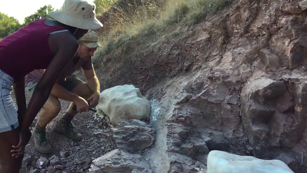 Le soleil vient à peine de se lever sur le veld sud-africain et arrache déjà quelques ahanements à la colonne de scientifiques qui crapahute à flanc de colline, sacs au dos, à la poursuite d'un reptile disparu il y a 200 millions d'années. Encore quelques mètres d'efforts et les voilà à pied d'œuvre : au milieu, des éboulis gisent deux gros blocs de pierre qui cachent les secrets d'un effrayant ancêtre de nos crocodiles actuels. Trois ans déjà que le professeur Jonah Choiniere et son équipe de l'université du Witwatersrand à Johannesburg sont lancés à ses trousses. Leur traque les ramène aujourd'hui au milieu des zébus et des impalas d'une ferme de Rosendal, dans le centre de l'Afrique du Sud, là où tout a commencé. "En 2015, un de mes étudiants est tombé ici sur des os qui dépassaient du sol", raconte le paléontologue américain. "On a creusé et on les a ramenés au labo. Et puis on s'est rendu compte qu'il s'agissait de la hanche d'une espèce totalement inconnue", poursuit-il. "Trois ans plus tard, nous revenons ici pour mettre au jour le reste de ce spécimen." L'opération est délicate. Avant d'être arrachée à la paroi, la pierre où sont emprisonnés les fossiles est soigneusement enveloppée d'une fine couverture protectrice de plâtre. Au moins cinq heures de séchage, quelques coups de burin bien placés, trois paires de bras et le bloc est retourné sans casse. Ces dernières années, l'Afrique du Sud s'est imposée comme un des terrains de jeu favoris des chasseurs de dinosaures.