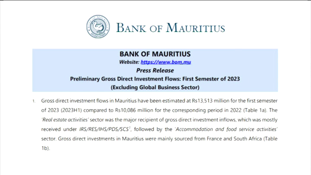 La Banque de Maurice a publié les chiffres concernant les investissements directs bruts pour le premier semestre de 2023. On note une hausse par rapport à la même période en 2022. Le flux d’investissements directs bruts est ainsi estimé à plus de Rs 13,5 milliards. C’est l’immobilier qui a attiré le nombre le plus élevé d’investissements cette année.