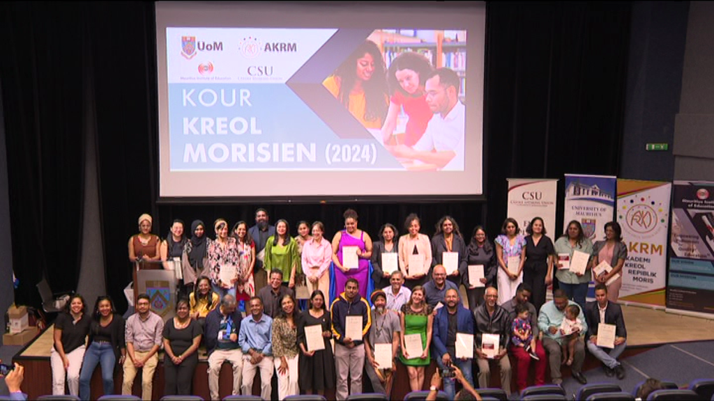 Une trentaine de participants aux cours de KREOL MORISIEN ont reçu leurs certificats ce matin. Cette formation a été dispensée par l’université de Maurice et l’Akademi Kreol Repiblik Moris, en collaboration avec le Mauritius Institute of Education  et la Creole Speaking Union .