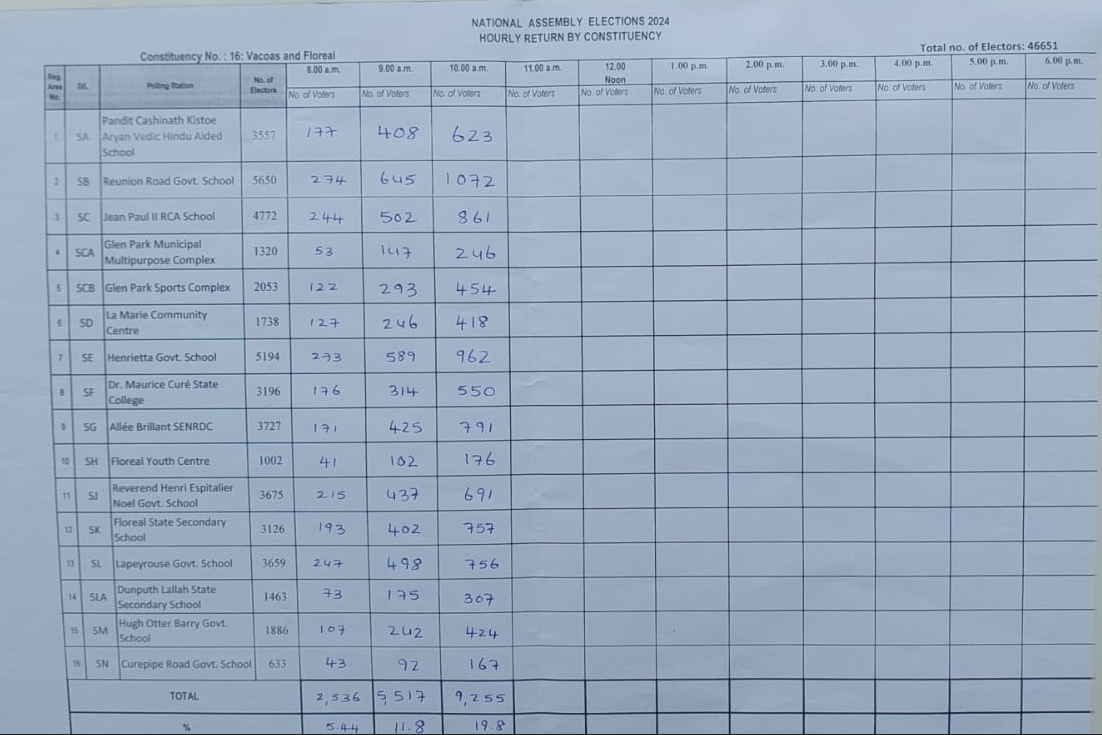 Dans la circonscription n° 16, plus précisément à l’école Pandit Cashinath Kistoe Aryan Vedic Hindu Aided, l'exercice du vote se déroule calmement, avec une présence renforcée de la force policière et une quinzaine d'officiers du bureau du commissaire électoral. La candidate de l'Alliance du Changement, Jyoti Jeetun, est également sur place pour observer le déroulement du vote. Les personnes âgées sont accompagnées par des membres de leur famille pour faciliter leur participation. À 10 h 00, le Deputy Returning Officer annonce un taux de participation de 9 255 votants, soit 19,8 %.