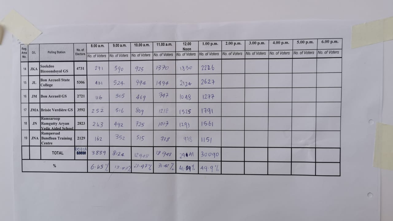 Dans la circonscription no. 9 Flacq/ Bon accueil, à 13 h 00, un grand nombre d’électeurs ont déjà voté, soit 30 090 représentant 49,9 %, marquant une participation significative en ce début de journée. Les électeurs sont nombreux à compléter l’exercice de leur droit de vote. La force policière reste également mobilisée pour veiller au bon déroulement du processus électoral.