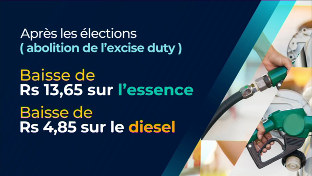 L’Alliance Lepep a annoncé une baisse cumulée de Rs 16 sur le litre d’essence et de Rs 7,45 sur celui du diesel à partir de janvier 2025 en cas de victoire. Cette baisse serait rendue possible grâce à une baisse annoncée de la TVA qui passerait de 15 à 10 % et de l’abolition de la taxe à l’importation (excise duty) sur ces produits pétroliers.