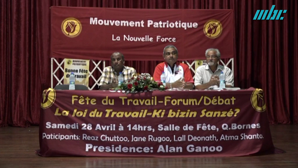 Le Mouvement Patriotique a tenu ce samedi 28 Avril 2018 un forum-débat dans le cadre de la Fête du Travail. C’était à Quatre Bornes. L’exercice était animé par un panel de syndicalistes composé de syndicalistes, soit Reaz Chuttoo, Lall Deonath, et Atma Shanto. Le thème appelait à un changement des lois régissant le monde du travail. Selon Alan Ganoo, ce forum-débat était la meilleure façon pour son parti de célébrer les 80 ans de la Fête du Travail à Maurice. Il a fait ressortir que dans un monde en constante évolution. l’environnement du travail a changé d’où le besoin d’avoir des législations qui protègent les employés. Selon Alan Ganoo, cela devrait notamment passer par des amendements à l'Employment Rights Act.