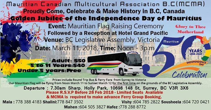 Les Mauriciens vivant à l’étranger marqueront aussi les 50 ans de l’Indépendance. En effet, la Mauritian Canadian Multicultural Association organisera pour la toute première fois une cérémonie solennelle de lever du drapeau le dimanche 11 mars devant les bâtiments du Parlement de Colombie-Britannique à Victoria. Cet événement réunira plus de 100 Mauriciens habitant la région de Vancouver.