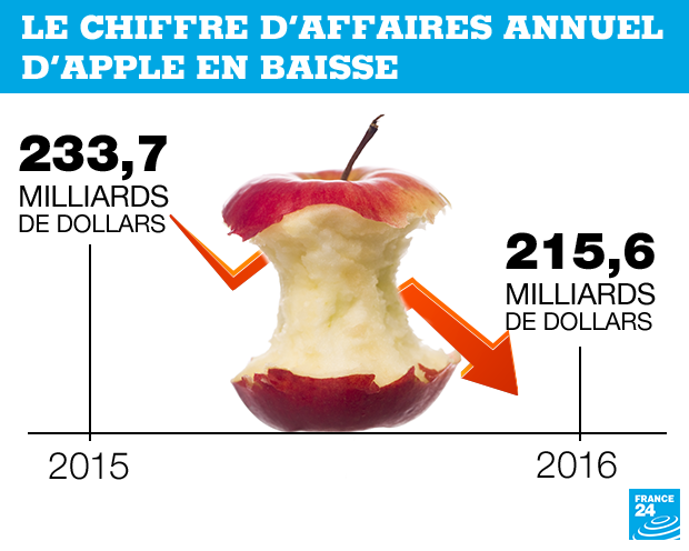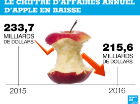 C'est une situation historique pour Apple. Depuis que Steve Jobs avait entamé sa stratégie de reconquête avec le lancement de l'iPod en 2001, le chiffre d'affaires de la marque à la pomme n'avait eu de cesse d'augmenter. Cette success-story a atteint ses limites en 2016 : pour la première fois en quinze ans, Apple a connu un recul de son chiffre d'affaires annuel, qui est passé de 233,7 milliards de dollars en 2015 à 215,6 milliards de dollars.
