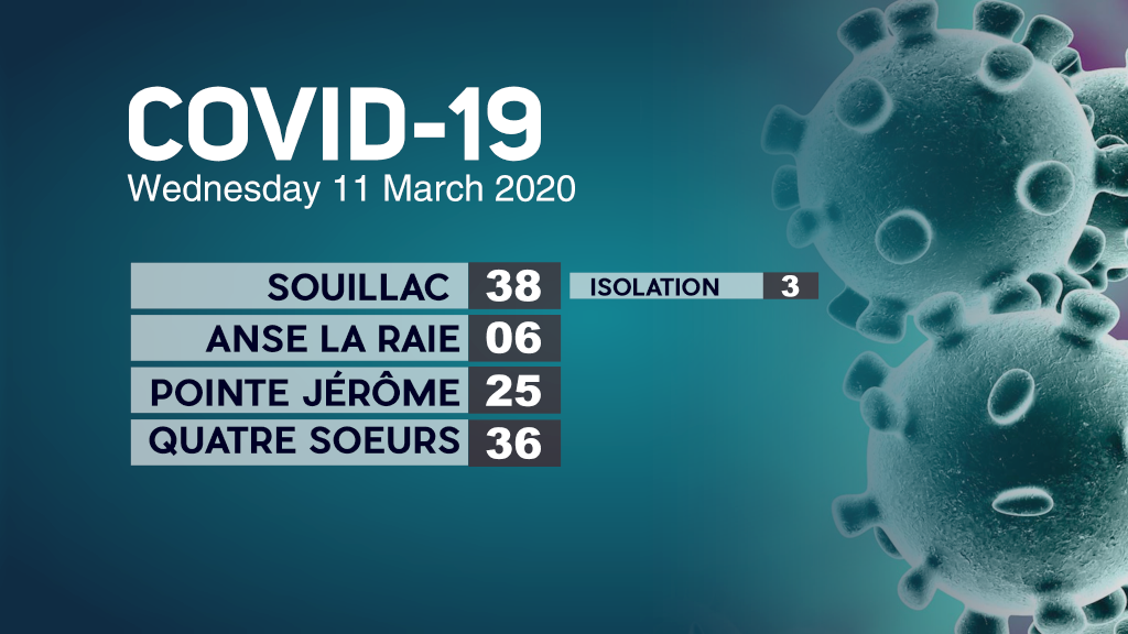 108 personnes au total sont en observation dans les quatre centres de quarantaine à Maurice en ce mercredi 11 mars. À l'hôpital de Souillac, 3 personnes sont en isolement et 38 en quarantaine. À Anse La Raie, 6 personnes sont en quarantaine. Et puis 25 personnes sont en quarantaine à Pointe-Jérome et 36 à Quatre-Soeurs.