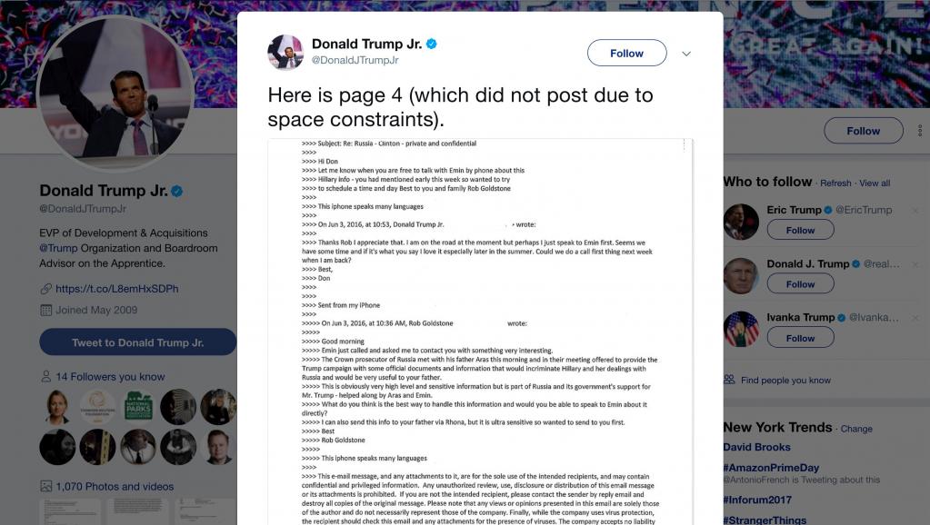 Le New York Times qui a dévoilé un rendez-vous de Donald Junior avec une avocate russe, était sur le point de prouver le sérieux de son enquête, en publiant des emails incriminant plus avant, les proches du président. Donald Jr a pris les devants, et rendu public une série de messages très instructifs pour les enquêteurs.