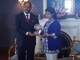 L'ambassadeur Mussie Hailu, du United Religions Initiative a remis l'Africa Peace Award a la présidente de la République, le Dr Ameenah Gurib-Fakim ce jeudi a la State House a Réduit. Cet Award est une reconnaissance de la contribution du Dr Ameenah Gurib-Fakim dans le domaine de la recherche scientifique sur le continent Africain, mais aussi son engagement a promouvoir une culture de paix et d'harmonie. C'est aussi une récompense pour ses publications, entre autres sur l'usage des plantes médicinales africaines. Le URI a crée le Africa Peace Award en 2003 avec l'idée de promouvoir un développement soutenu en Afrique dans le respect de la démocratie et de la bonne gouvernance, tout en reconnaissant un leadership efficace dirigé vers la paix et la sécurité sur le continent Africain.