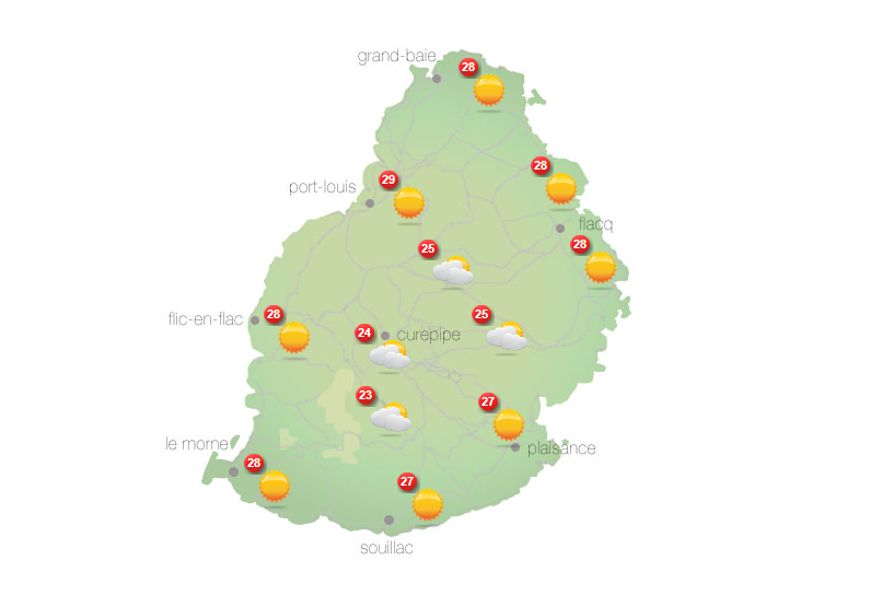 Aprés quelques faibles ondées tôt ce matin sur les hauts, le temps sera ensoleillé sur l'ensemble de l'île au cours de la journée.