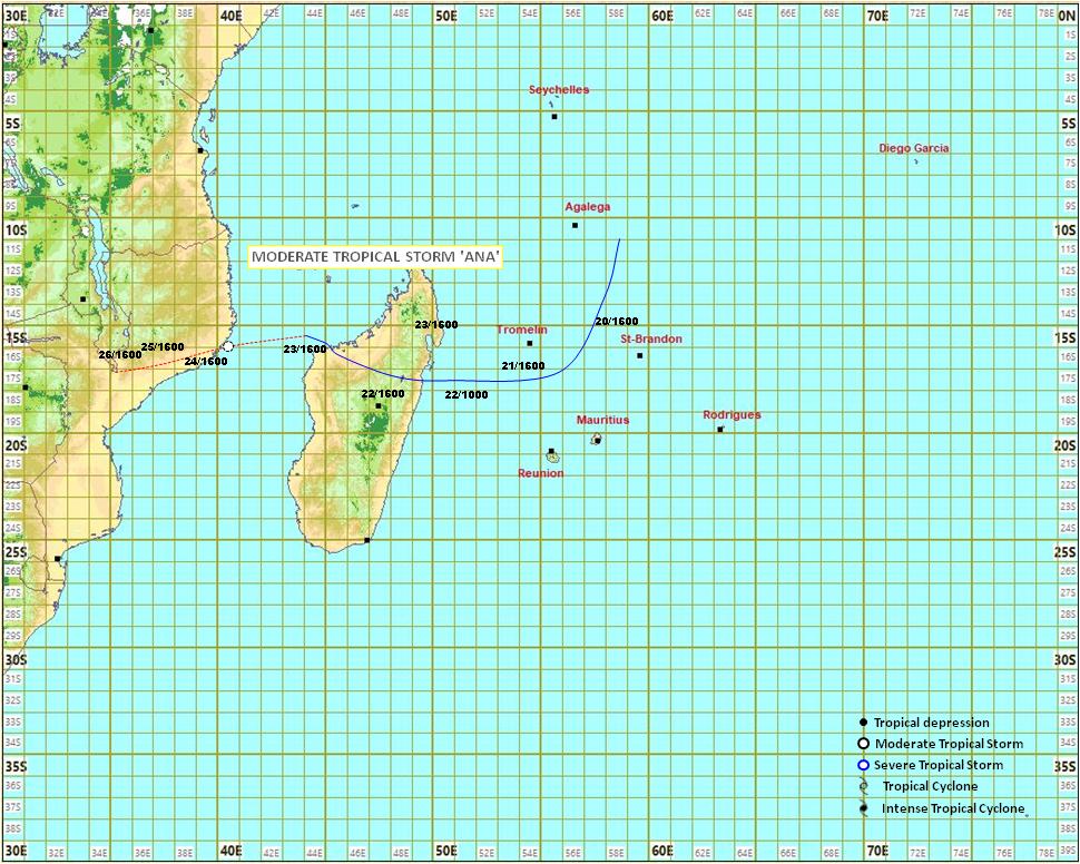 À 4 heures, la dépression tropicale s'est intensifiée en une tempête modérée et a été baptisée 'ANA'. Elle évolue dans le canal de Mozambique et poursuit son déplacement vers l'ouest à environ 15 km/h.