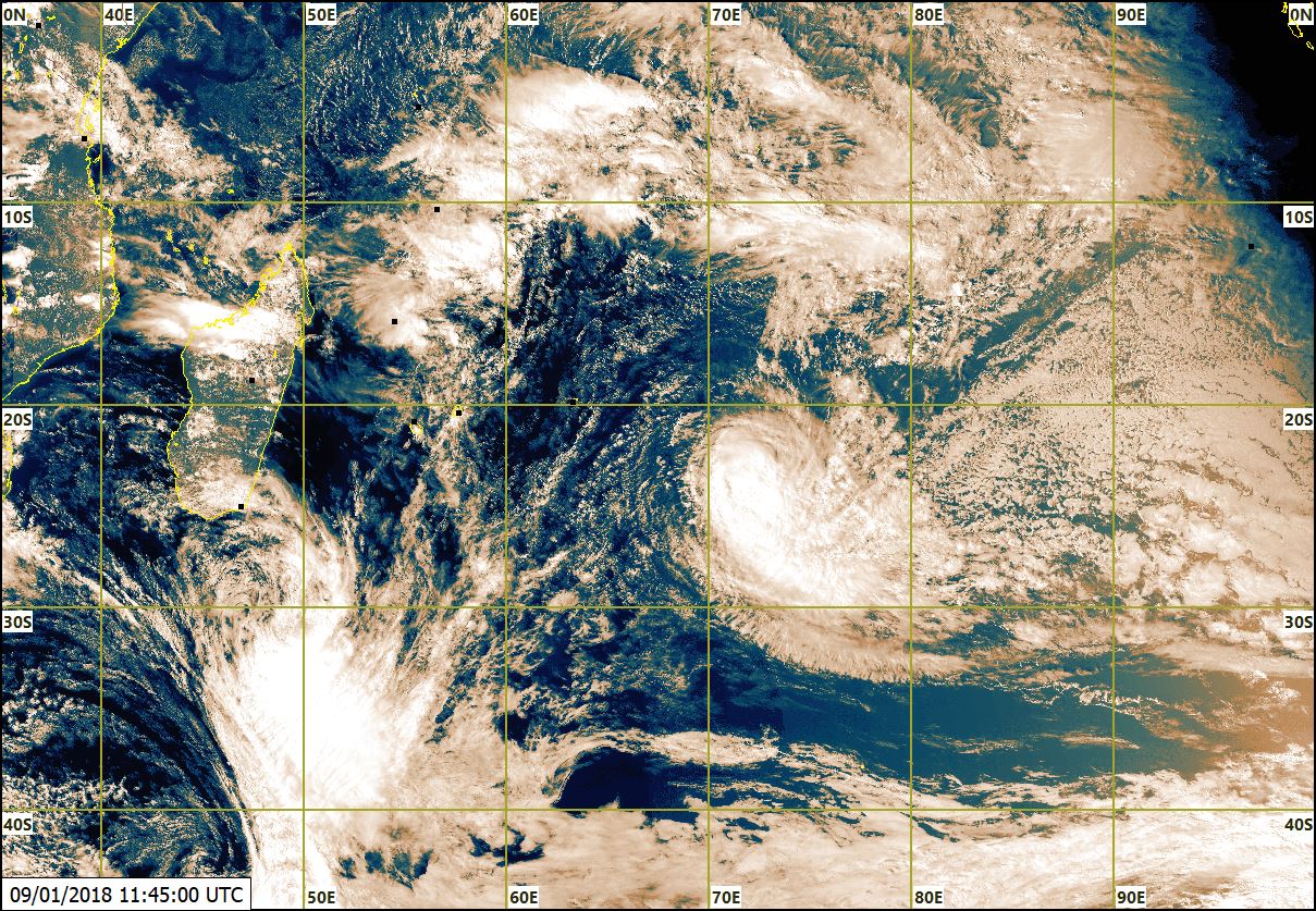 (A) A 1600 heures, la dépression post-tropicale 'Ex-AVA' était centrée autour du point 30.6 degrés Sud en latitude et 48.4 degrés Est en longitude. Elle s'éloigne d'avantage de notre région.
