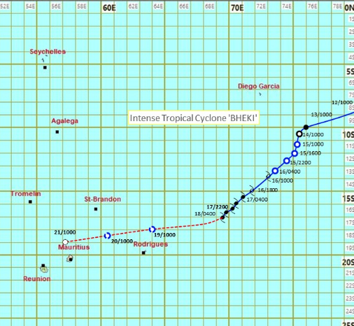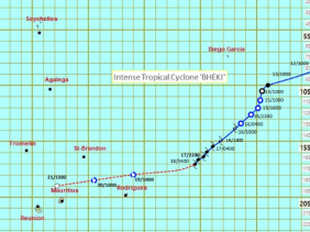 À 04h00, l'intense cyclone tropical BHEKI était centré à environ 710 km à l’est-nord-est de Rodrigues, en latitude 17,1 degrés sud et longitude 69,5 degrés est. Il se déplace dans une direction générale sud-ouest à environ 10 km/h.