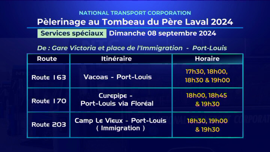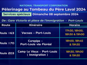 Nous sommes à quelques heures du pèlerinage au tombeau du Bienheureux Père Laval. Comme les années précédentes, les autorités ont effectué plusieurs déviations sur nos routes à partir de dimanche matin. Elles concernent notamment la route Nicolay et la route de Pamplemousses, qui seront fermées à la circulation à partir de dimanche à 15 h 00. L’allée Père Laval sera déclarée zone piétonnière dimanche après-midi. La CNT desservira un service spécial vers le tombeau depuis la gare Victoria et la Place Immigration à Port Louis, tandis que le Metro Express opérera de Curepipe à Port Louis jusqu’à une heure 30 du matin.