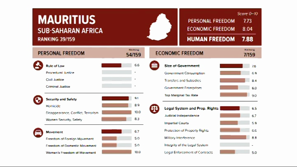 L’Indice de la liberté humaine 2017 vient d’être rendu public. Maurice se classe a la 39eme place sur 159 pays et 1er en Afrique. C’est la Suisse qui en arrive en tête de ce classement. Pour le réaliser, les chercheurs ont pris en compte 79 indicateurs de liberté personnelle et économique.